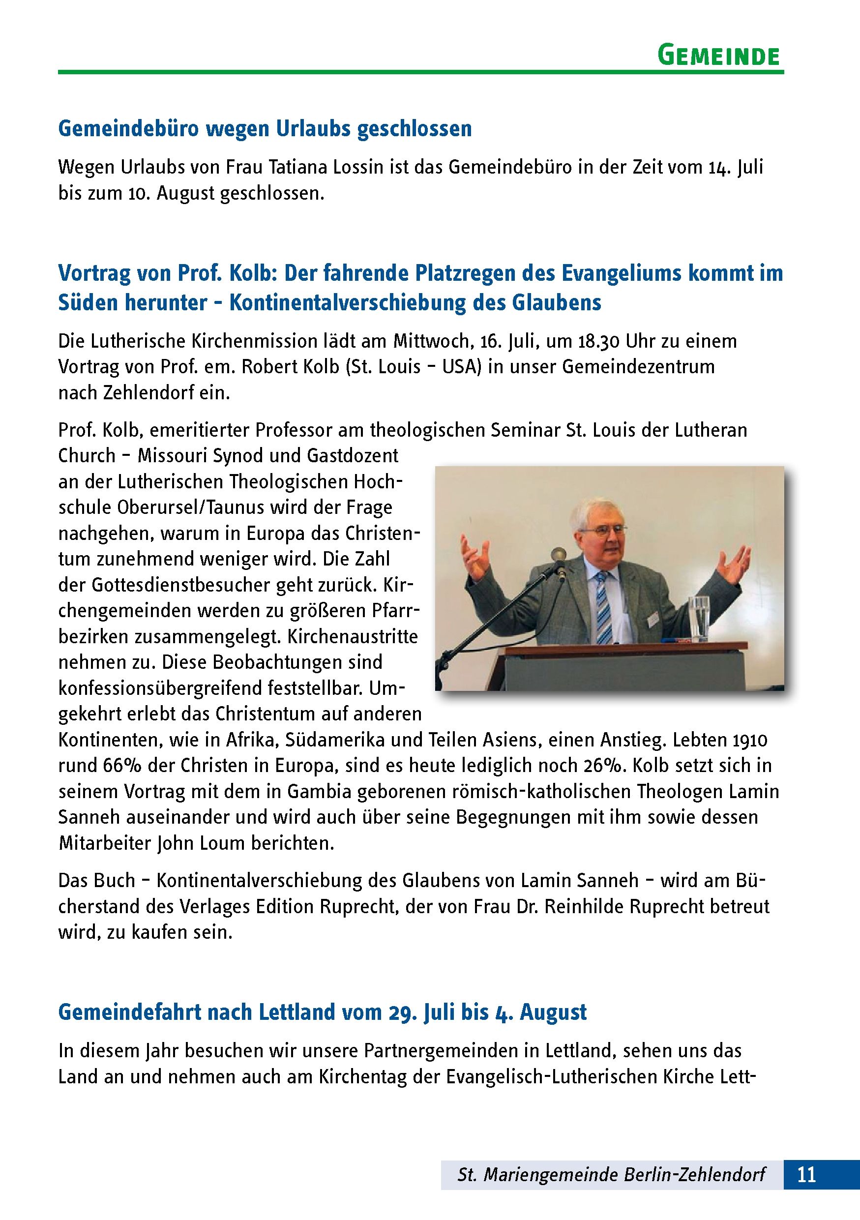 So lautete der Titel des Vortrags, den unser Autor Robert Kolb (USA) auf Einladung der Lutherische Kirchenmission in der St. Mariengemeinde in Berlin-Zehlendorf hielt. Prof. Kolb, emeritierter Professor am theologischen Seminar St. Louis der Lutheran Church – Missouri Synod und Gastdozent an der Lutherischen Theologischen Hochschule Oberursel/Taunus beschäftigte sich mit der Frage, warum in Europa das Christentum konfessionsübergreifend weniger wird. Lebten 1910 rund 66% der Christen in Europa, sind es heute lediglich noch 26%. Umgekehrt erlebt es auf anderen Kontinenten, wie in Afrika, Südamerika und Teilen Asiens einen Anstieg.